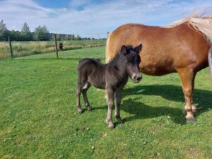 Net als moeder Flower v.h. westeinde, besloot Olaya v.h. westeinde (V: Tom v. Veldhuizen) toch eerder te veulenen dan ze was uitgerekend. Hoewel ze uitgerekend was op 2 juli, stond ze ’s nachts; als gezelschap voor moeder, wel al op stal onder de camera, maar van uiervorming was in het geheel nog geen sprake. Het zou haar eerste veulen worden, dus dan ben je toch altijd nog iets alerter, maar dat heeft haar er dus niet weerhouden om in de nacht van dinsdag op woensdag 18 juni, geheel zelfstandig een mooi zwart merrieveulen ter wereld te brengen. Niet heel groot, maar wel heel alert en daarbij spoorde ze moeder geregeld aan om wat meer melk te geven, want veel uier was ook nu nog niet aanwezig. Wat extra voer en vers gras moet er voor zorgen dat dit veulen mooi op zal groeien.