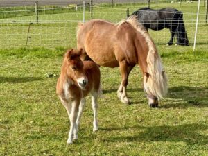 Een dag nadat het eerste veulen werd geboren zag op 9 mei het tweede veulen van dit jaar het levenslicht. Het betreft een voskleurig hengstveulen van moeder Glitter v.h. Zuid (V; Zorro v. onnen). Ook hier is natuurlijk de zwarte L.A. v. stal Polderzicht de vader. Ondanks de camera bewaking en de frequente controle was de geboorte me toch ontgaan en liep er s’morgens bij het wakker worden; net als bij het eerste veulen het geval was, een gezond veulen in de stal te springen. L.A. heeft dus ook in Berkhout bewezen voskleurige veulens te kunnen brengen. We zijn op de goede weg wat kleur betreft, nu nog hopen of er nog een voskleurig merrieveulen in het verschiet ligt